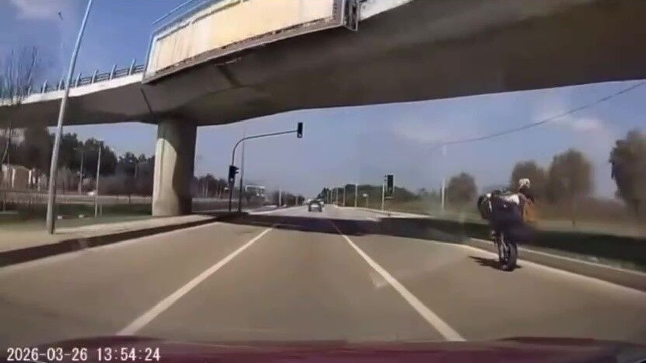 Görüntülerde, motosikletin uzun süre tek teker üzerinde gittiği ve trafikteki diğer araçlara aldırış etmeden yoluna devam ettiği görüldü. Olay, trafikte sorumsuz sürüşün oluşturabileceği riskleri bir kez daha gözler önüne serdi.