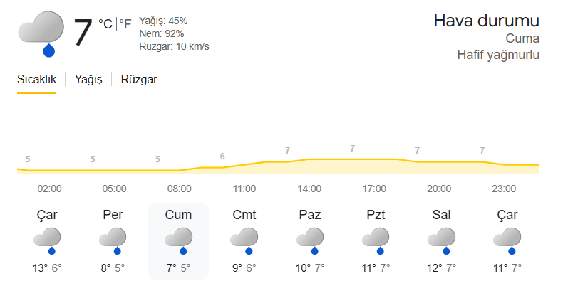 Cumartesi günü de kentte yağışlı hava etkisini sürdürecek. Meteorolojik tahminlere göre gün boyunca aralıklı yağmur görülebilir. Sıcaklıkların gündüz 7–10 derece civarında seyredeceği tahmin edilirken rüzgarın hafif esmesi bekleniyor.