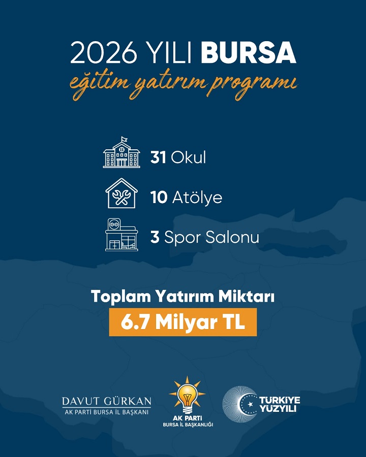 AK Parti Bursa İl Başkanı Davut Gürkan, Bursa’da Devlet Yatırım Programı’na alınan 31 okul projesine ilişkin yaptığı açıklamada, "Bursa’mızda eğitime yönelik yatırımlarımız kararlılıkla sürüyor. 2025 yılında hazırlıklarına başlanan ve 2026 yılı yatırım programına alınan ilimiz genelinde 680 sınıflı 31 okul inşa edilecek. Modern ve depreme dayanıklı yeni eğitim yuvalarını etap etap 2028 yılına kadar tamamlamayı hedefliyoruz. Yık-yap ve yeni okul inşaatlarımız kapsamında 10 atölye ve 3 spor salonunu da öğrencilerimizin hizmetine sunacağız. Anaokullarından meslek liselerine kadar farklı kademelerde 10 ilçemizde yapılacak eğitim kurumlarımızı 6,7 milyar liraya yaklaşan büyük bir bütçe ile hayata geçiriyoruz" dedi.