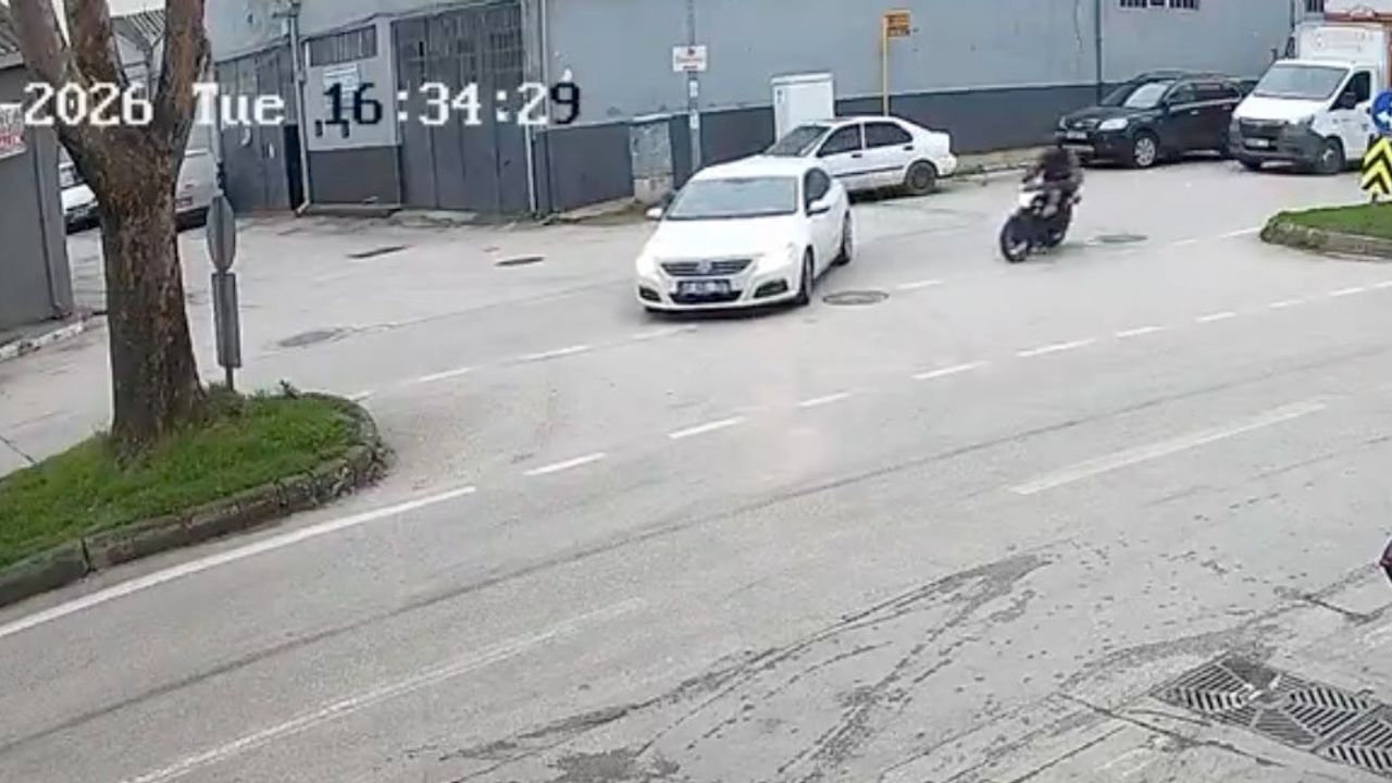 Bursa'da bir otomobil kontrolsüz şekilde dönüş yapmak isteyince motosikletle çarpıştı. Kaza anı kameraya yansırken, motosikletli genç yaralandı.