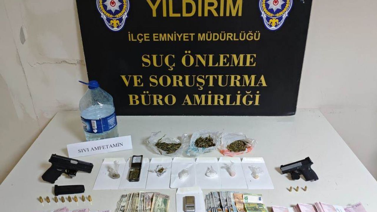 Bursa Emniyet Müdürlüğü Yıldırım İlçe Emniyet Müdürlüğü'ne bağlı Yıldırım Suç Önleme ve Soruşturma Büro Amirliği ekiplerince yapılan çalışmalarda, Yeşil Mahallesi'nde bulunan bir ikamette, hakkında farklı suçlardan 4 yıl 2 ay kesinleşmiş hapis cezası bulunan Yelid A.'nın saklandığı aynı adreste, uyuşturucu madde ticareti yapıldığı ve ruhsatsız silah bulundurulduğu bilgisine ulaşıldı.
