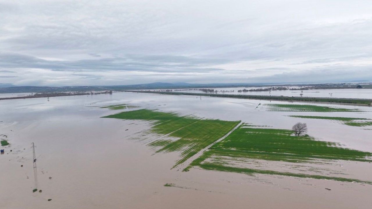 Dron ile kaydedilen görüntülerde, tarım arazilerinin büyük bölümünün suyla kaplandığı dikkat çekerken, taşkının boyutu havadan daha net şekilde ortaya kondu.