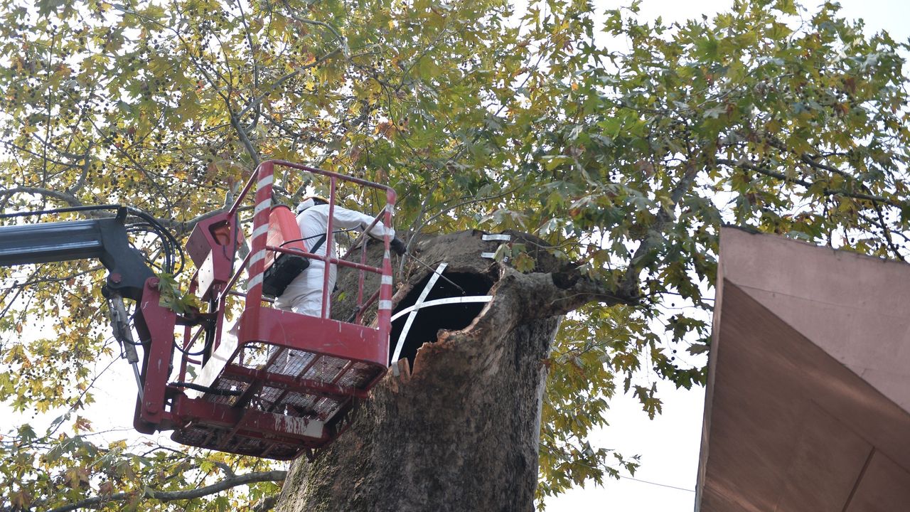 Park ve Bahçeler Dairesi Başkanlığı ekipleri tarafından yapılan incelemede, anıt ağacın açık yarasında çürümüş ve mantarlaşmış bölümler tespit edildi. Hızlı bir şekilde bakım ve restorasyon işlemlerine başlayan ekipler, özel ilaçlarla ‘çürümeye yol açan’ bakterileri temizledi. Ağacın iskeletine teller aracılığıyla destek uygulanırken, son aşamada özel yalıtım malzemesi kullanılarak ağacın açık yarası kapatıldı. Tedavi gören kısım boyanarak çınar ağacının formu yeniden düzenlendi.