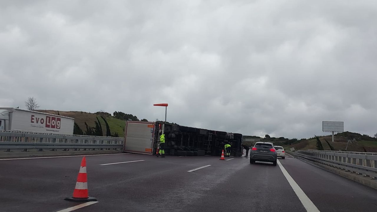 Bursa İstanbul otobanı Orhangazi Gebze arasındaki bir viyadükte tır fırtınanın etkisiyle devrildi. Diğer sürücüler de panik yaptılar. Aracın sürücüsü direksiyondan hafif yaralı olarak kurtuldu.