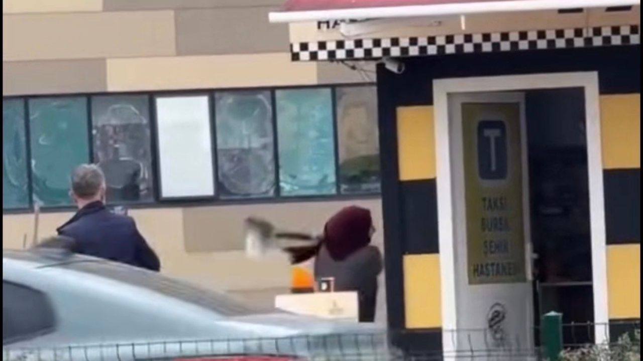 Olay, merkez Nilüfer ilçesi Doğanköy Mahallesi Bursa Şehir Hastanesi taksi durağında meydana geldi. Edinilen bilgiye göre, taksiye binmek için durağa gelen sağlık görevlisi S.B. (32) sıradaki taksinin dolu olduğu belirtilerek bir sonraki taksiye yönlendirildi. Bunun üzerine görevliyle tartışmaya başlayan kadın, sinirlenerek durağa saldırdı. Şüphelinin, durakta bulunan ayaklı seyyar küllük ve boya kutularıyla taksi durağının camlarını, bilgisayar ekranını ve güvenlik kameralarını kırdığı, ayrıca bir cep telefonuna da zarar verdiği öğrenildi. O anlar bir vatandaş tarafından kayda alındı.