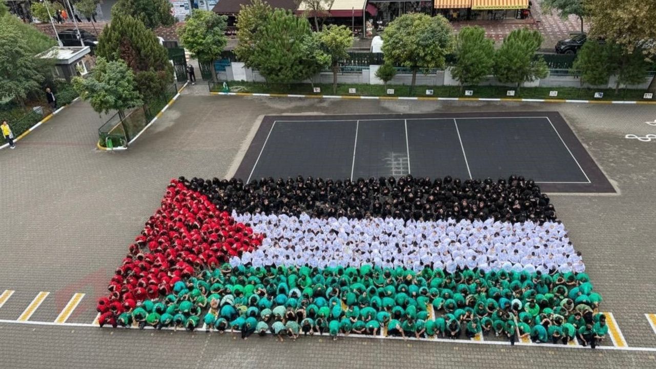 Etkinlik kapsamında öğrenciler, Filistin bayrağının renklerini taşıyan kıyafetler giyerek barış, kardeşlik ve dayanışma mesajı verdi. El ele vererek oluşturulan dev Filistin bayrağı, okul bahçesini adeta bir barış sahnesine dönüştürdü.